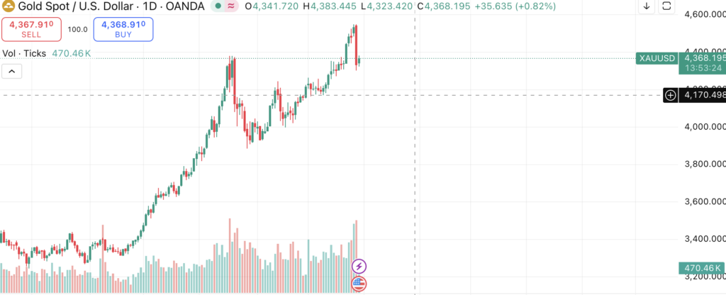 - Gold: Spot prices retreated rapidly from an all-time high near $4,500 per ounce, dipping to approximately $4,332.53, a single-day drop of about 4.39%. Despite this sharp correction, gold’s total gain for 2025 remains between 65% and 72%, marking its best annual performance since 1979.